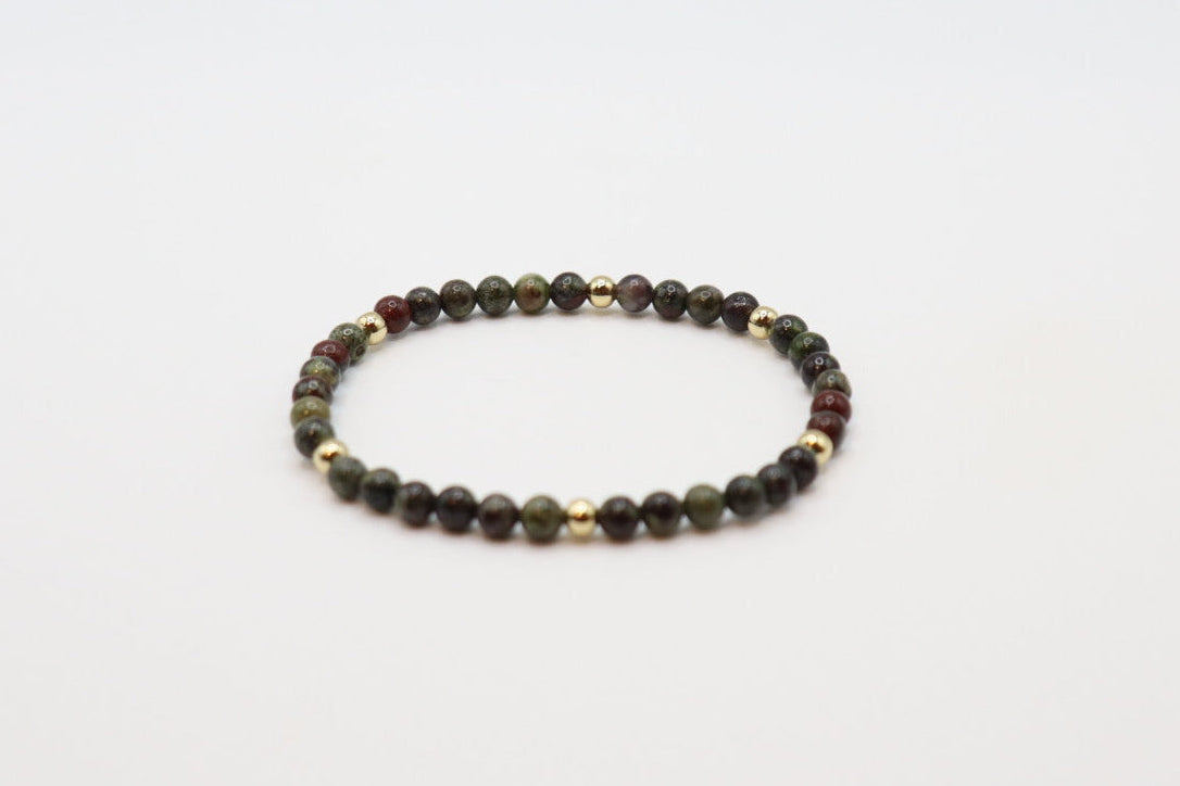 Designed with smaller Dragon Blood Jasper beads, and golden spacers, this bracelet offers a subtle yet powerful touch of strength and grounding energy. Known for encouraging courage and vitality, this stone brings a balanced boost of confidence to your everyday style.
