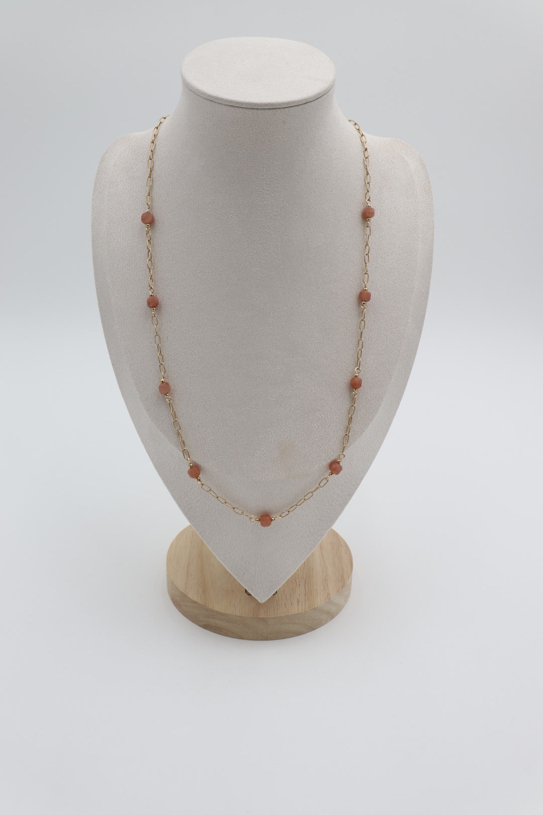 Sunstone long necklace, featuring faceted square “dice-cut” stones that catch the light with every movement. Its warm, natural shimmer makes it beautiful worn on its own as a statement strand—or effortlessly layered